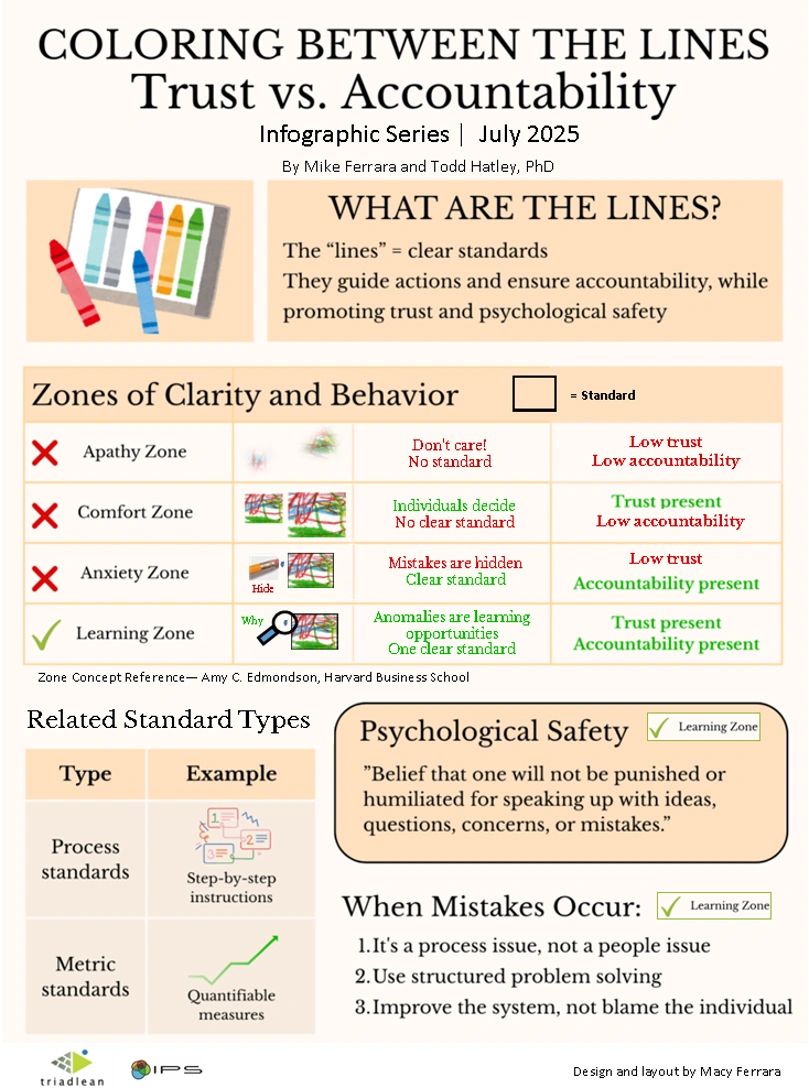 This infographic highlights the critical role leaders play in fostering a culture where trust and accountability coexist to reveal problems and drive improvement. Leaders are encouraged to approach anomalies with curiosity, not judgment. Using the simple analogy of coloring between the lines, we reference Amy C. Edmondson’s work from Harvard Business School and integrate our four straightforward examples.